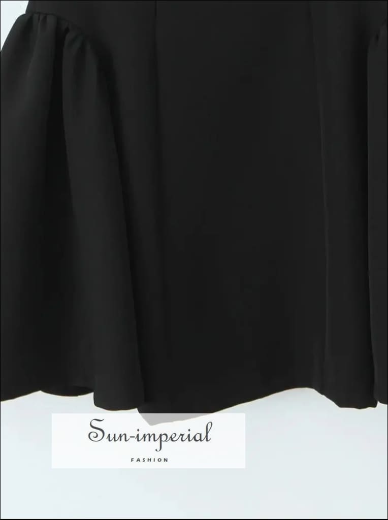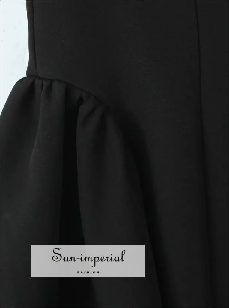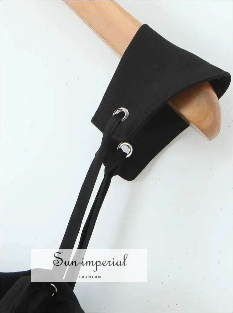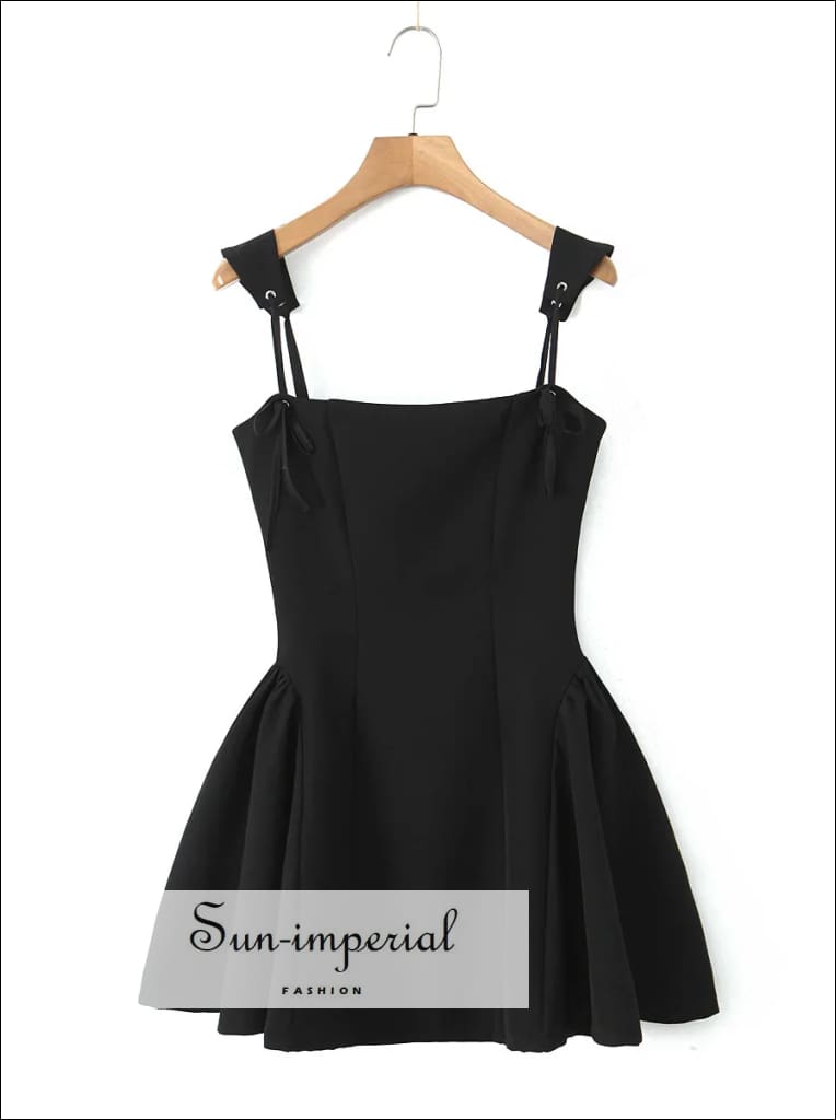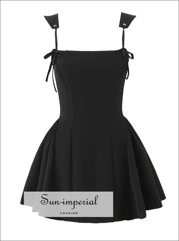This black mini dress features a corset-style bodice with rope-style sling straps and a delicate tie bow detail. Designed with a low waist silhouette, the dress flows into a soft skater-style skirt with gentle volume and movement. A cross lace-up back adds adjustability and a refined finish.