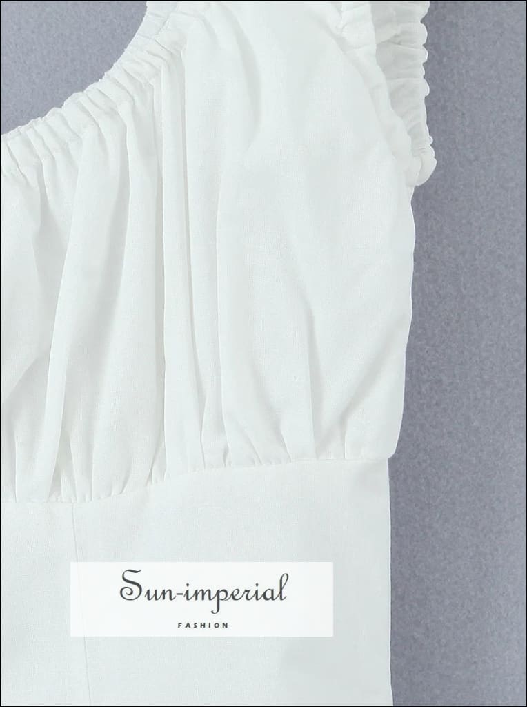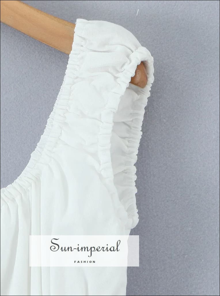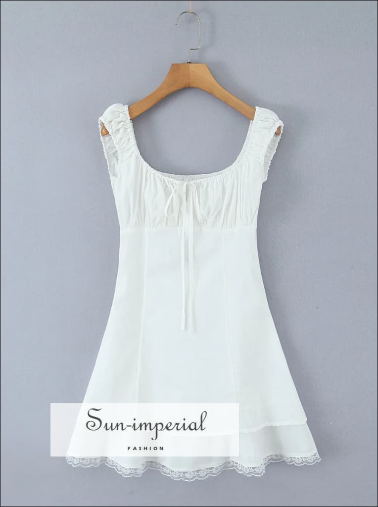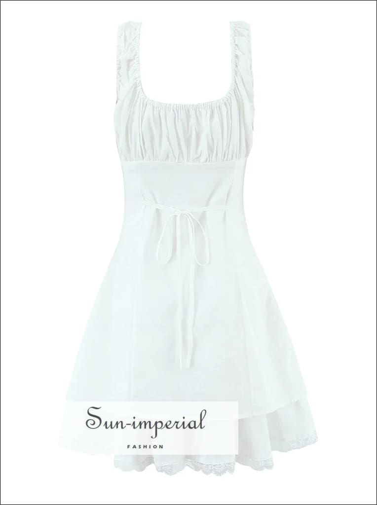 This sleeveless mini dress features a ruched bodice with a delicate bow detail for a soft, feminine look. Designed with an elastic back strap for a comfortable fit, the silhouette flows into a two-layer hem that adds subtle volume and movement.