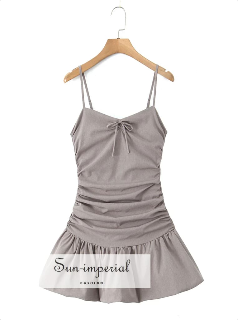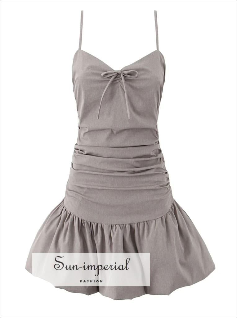 This mini dress features a corset-style bodice with ruched detailing and a soft bow accent at the front. Designed with a folded low waist and an open back, the silhouette flows into a swing-style skirt that adds light volume and movement.