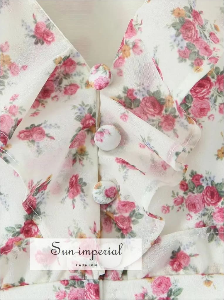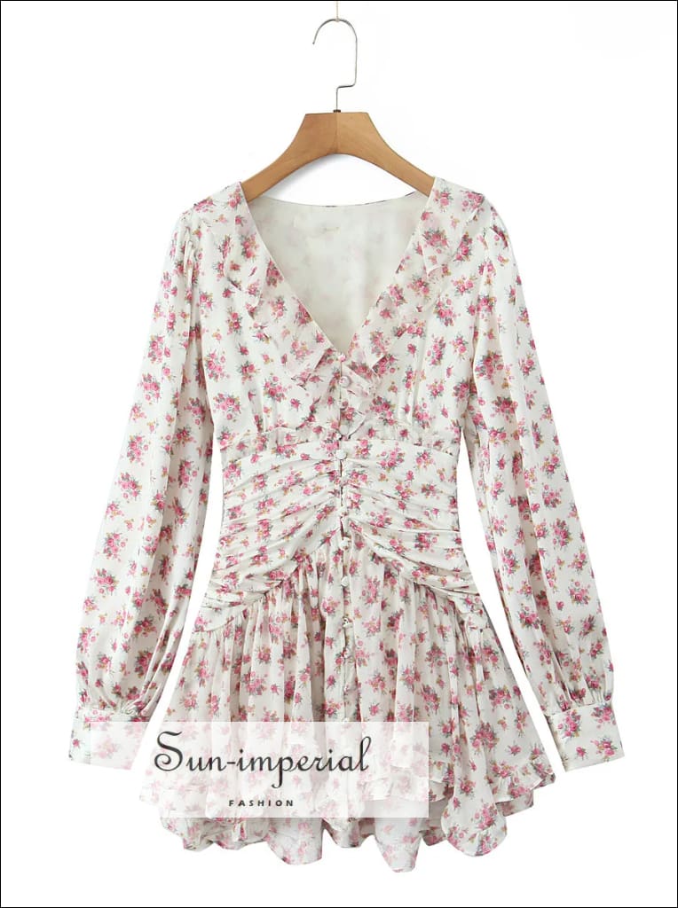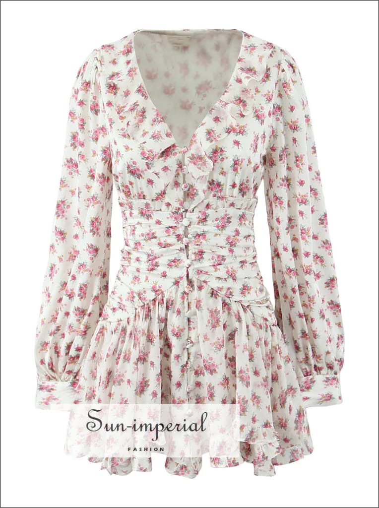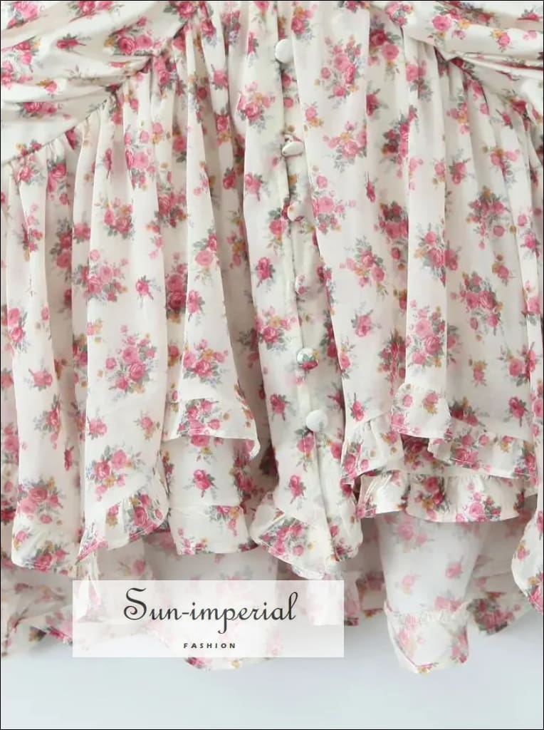 This mini shirt dress features a soft floral print in white and pink tones, designed with long puff sleeves and a classic button-front closure. The lightweight chiffon fabric creates an airy feel, while the ruffled hem adds gentle movement and a feminine finish.