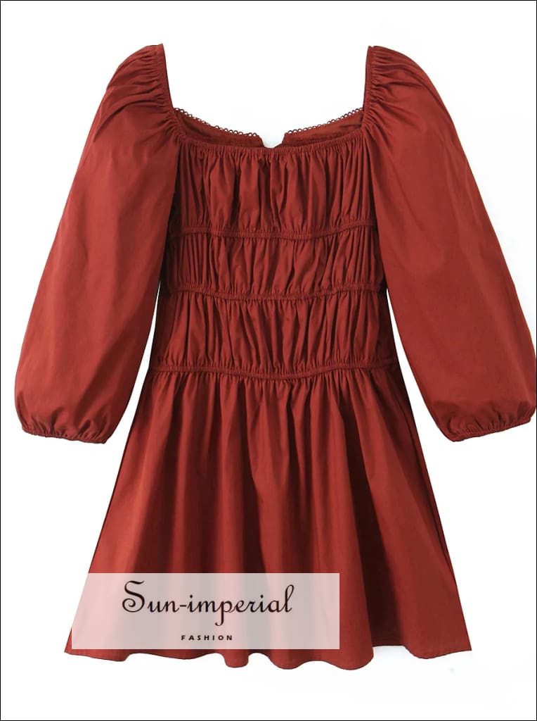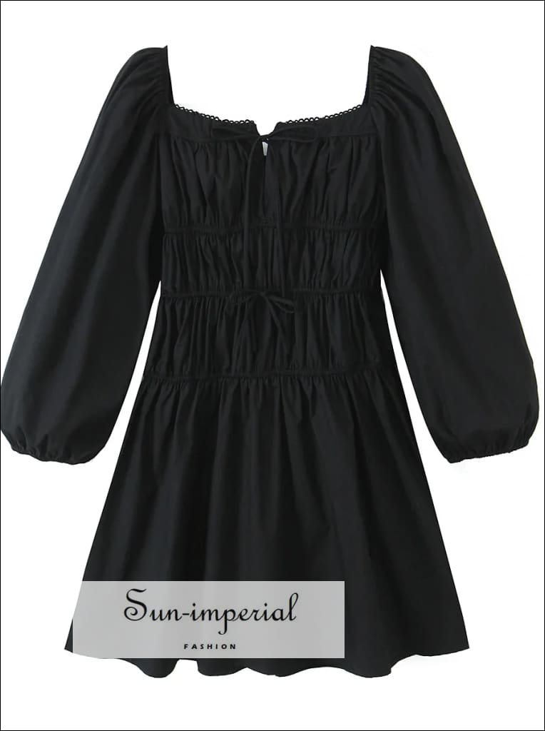 This French-inspired mini dress features a square neckline with a delicate bow detail and softly structured puff sleeves. Designed with a ruched elastic waist, the silhouette creates a flattering shape that flows into an A-line hem for easy movement and balance.