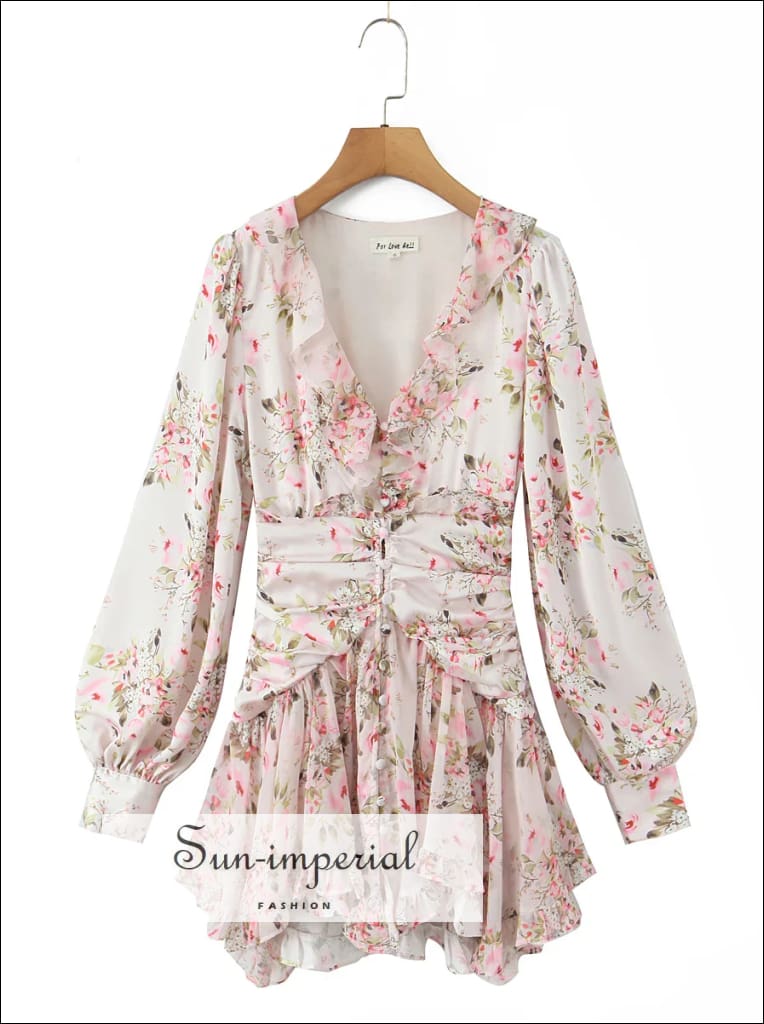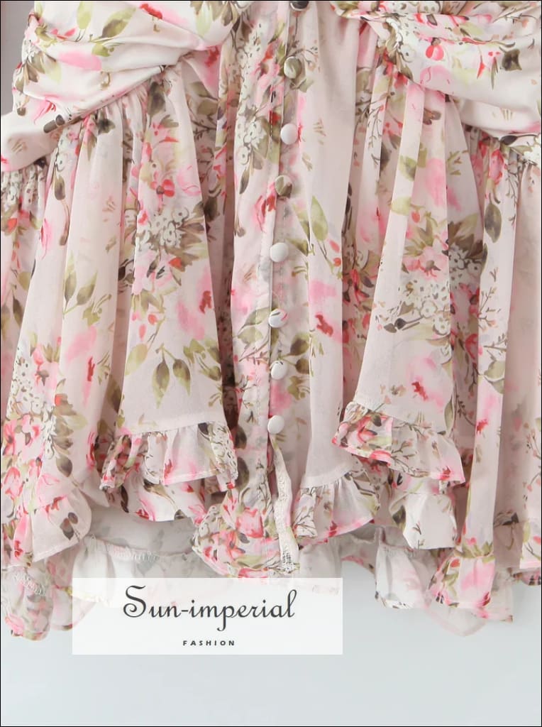 This feminine pink floral chiffon mini dress features puff long sleeves, a stand-out ruffled hem, and charming open buttons. Perfect for holidays, casual outings, or daytime events, it blends comfort with style.
