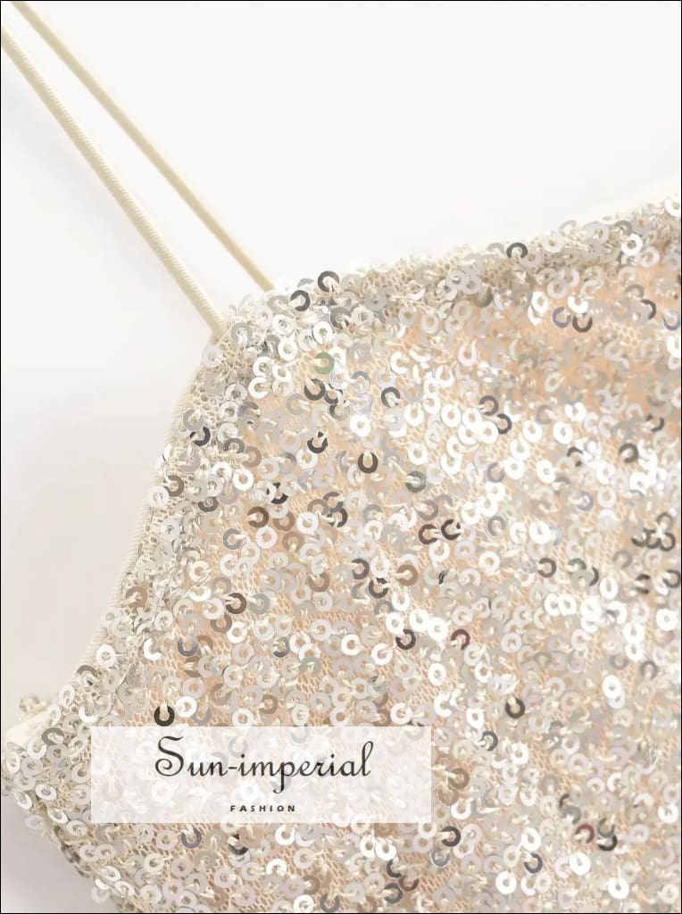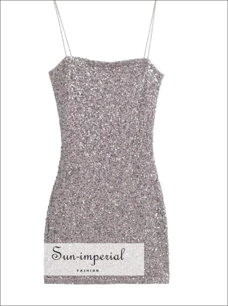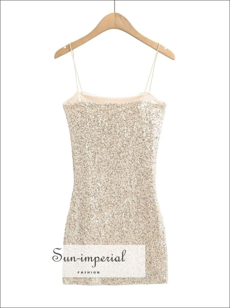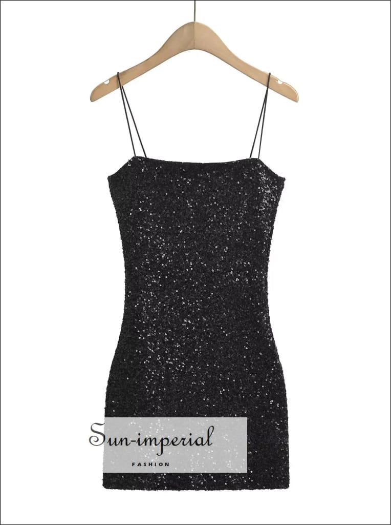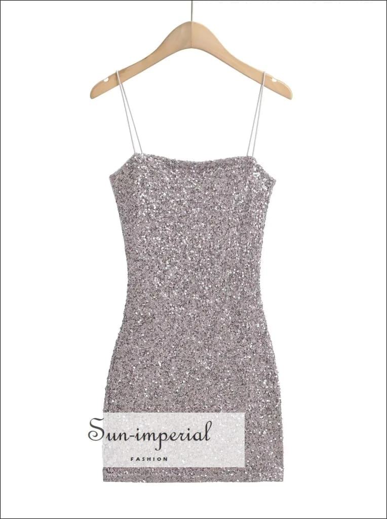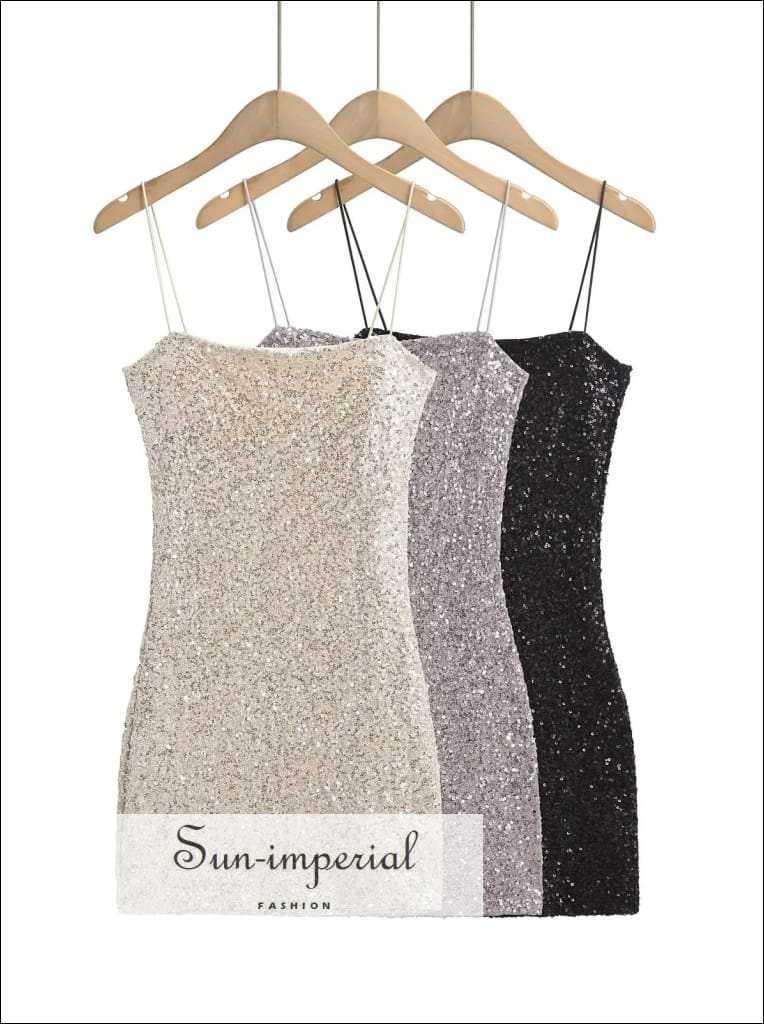 This sequin mini dress features a sleek sling design with a modern slash neckline and a smooth, body-skimming silhouette. The all-over sequin finish adds texture and shine while keeping the look clean and structured. Designed to contour the hips, the dress offers a polished fit with a lightweight feel.