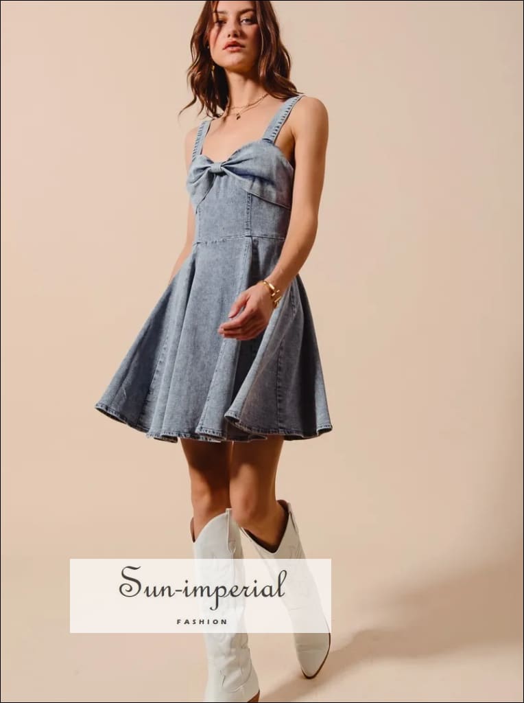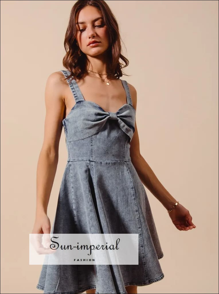 This mineral washed denim flare dress is a standout piece with a unique bow ribbon detail. The mineral wash adds a vintage touch to the stylish design. The flare silhouette enhances the feminine charm of this versatile dress. Make a statement in this trendy denim dress with a sweet bow ribbon accent.