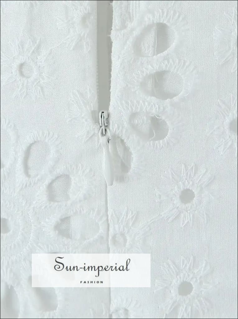 This white halter mini dress features delicate embroidery with subtle cutout detailing for a refined, airy look. Designed with a low waist silhouette, the dress flows into a soft swing skirt that creates movement and balance. A full inner lining provides coverage while maintaining a lightweight feel.