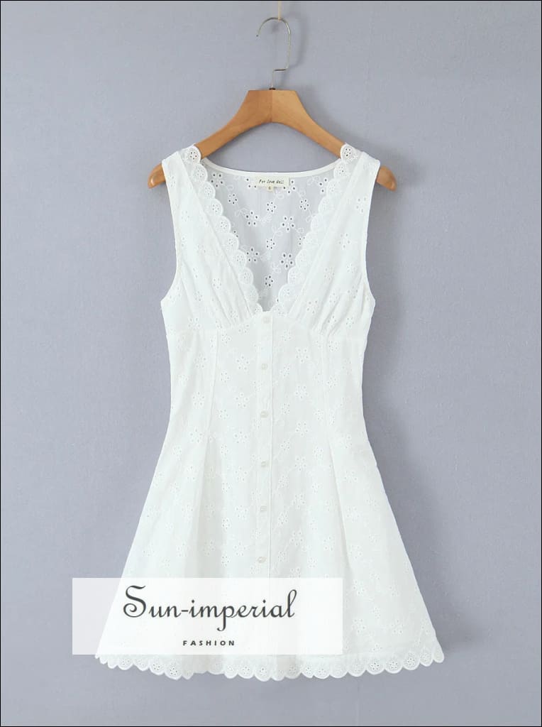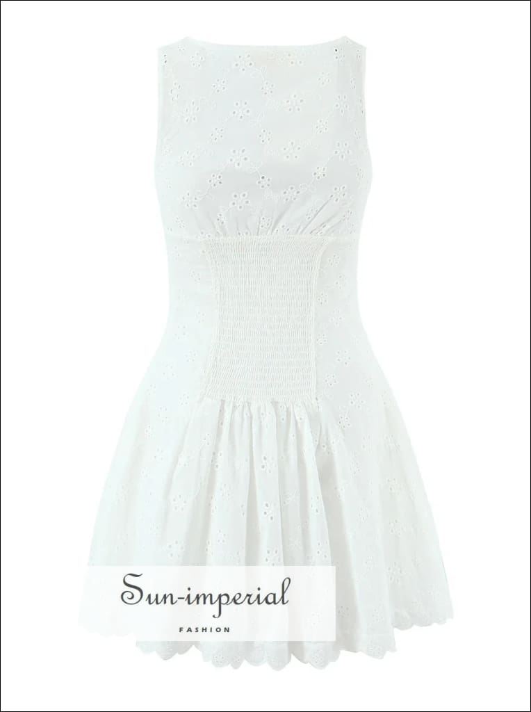 Elegant sleeveless mini dress featuring embroidered hollow-out lace, a flattering V-neck, elastic back waist, and bodycon A-line silhouette. Perfect for parties, summer outings, or holiday events.