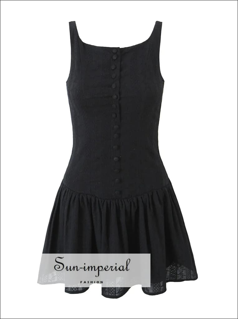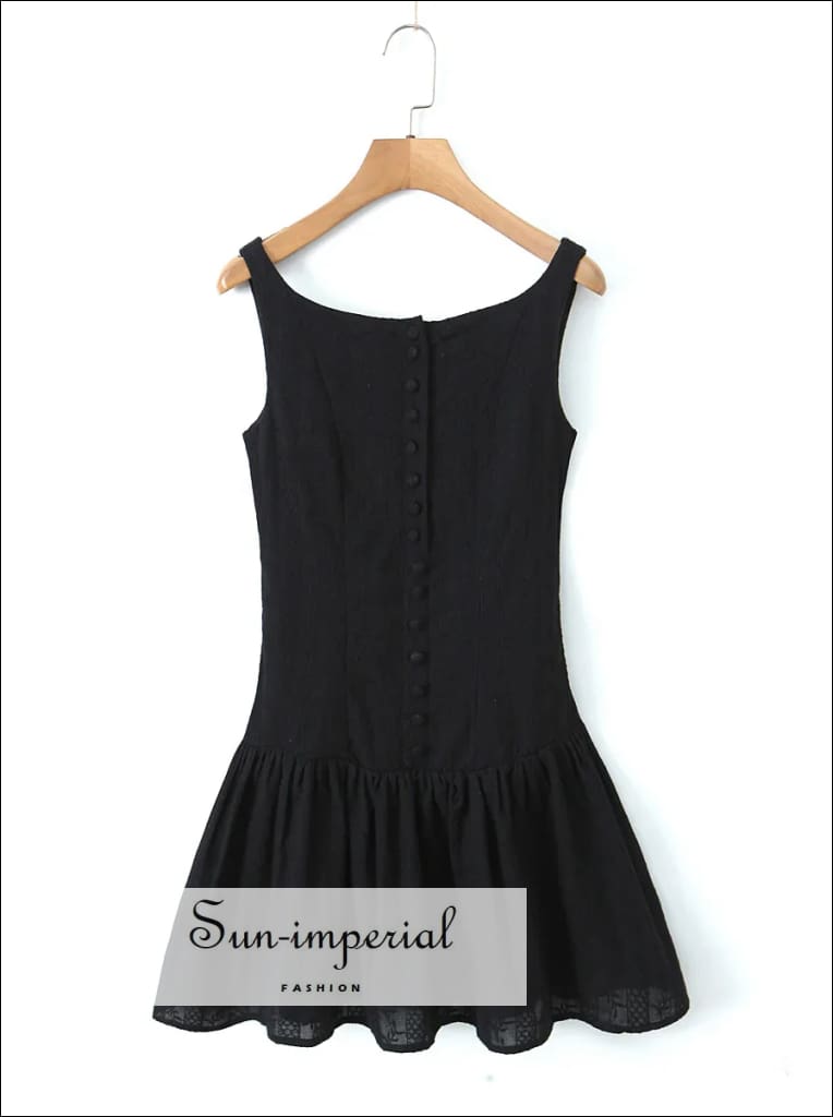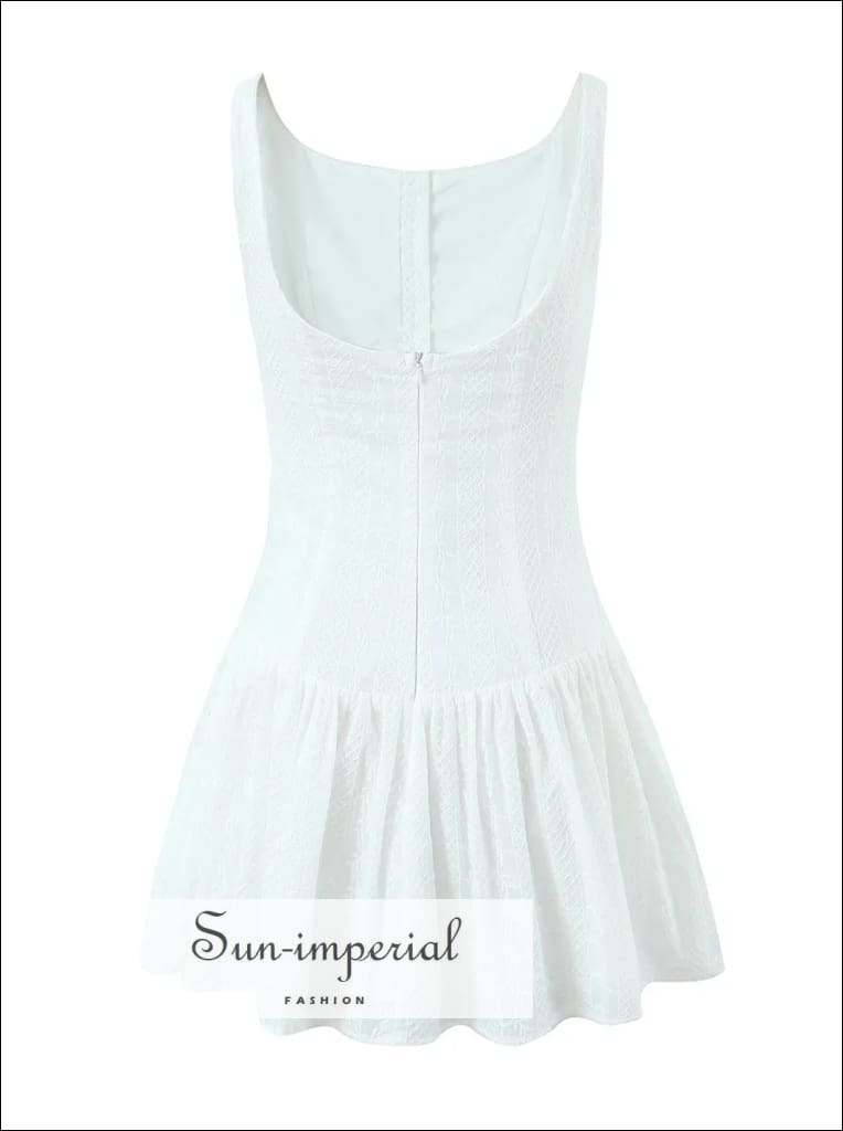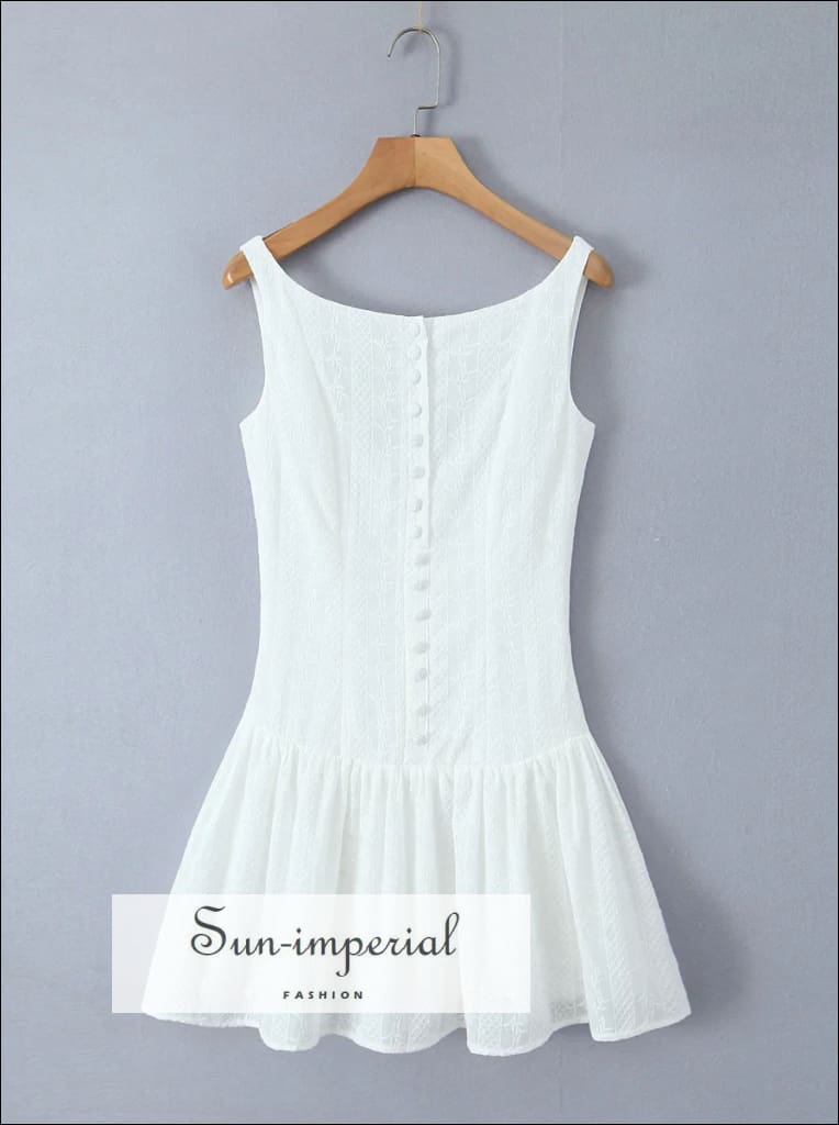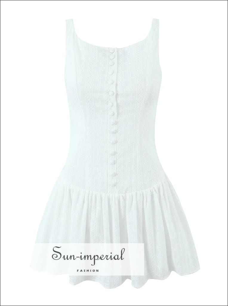 This white mini tank dress features delicate embroidered lace detailing with a clean, sleeveless silhouette. Designed with a low waist fit, the dress includes a button-front neckline and ruched hem that creates gentle movement and a soft swing shape.