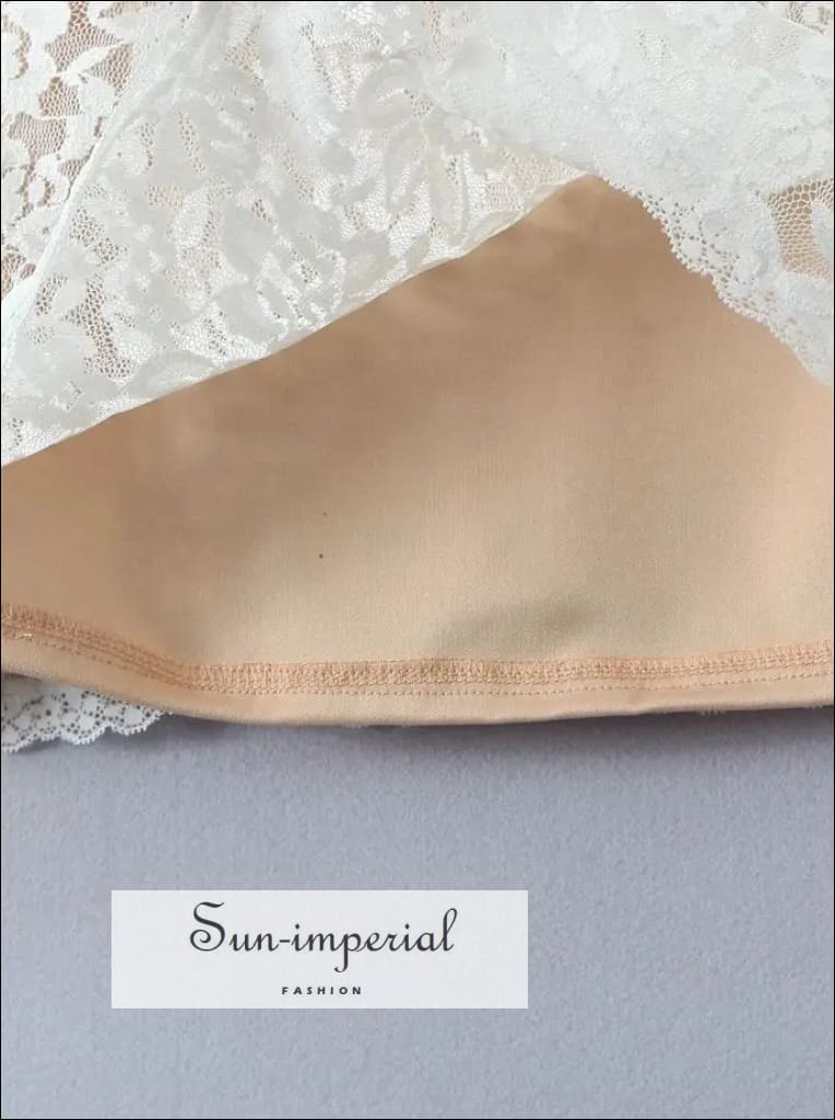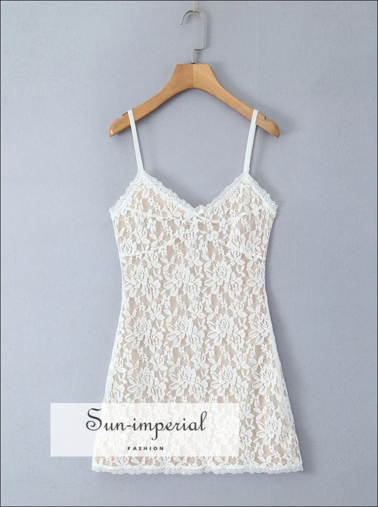 This white lace mini dress features a clean V-neckline with slim sling straps and a softly fitted silhouette. Designed to contour the body while remaining lightweight, the dress offers a smooth finish with delicate lace texture throughout.