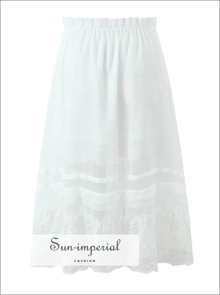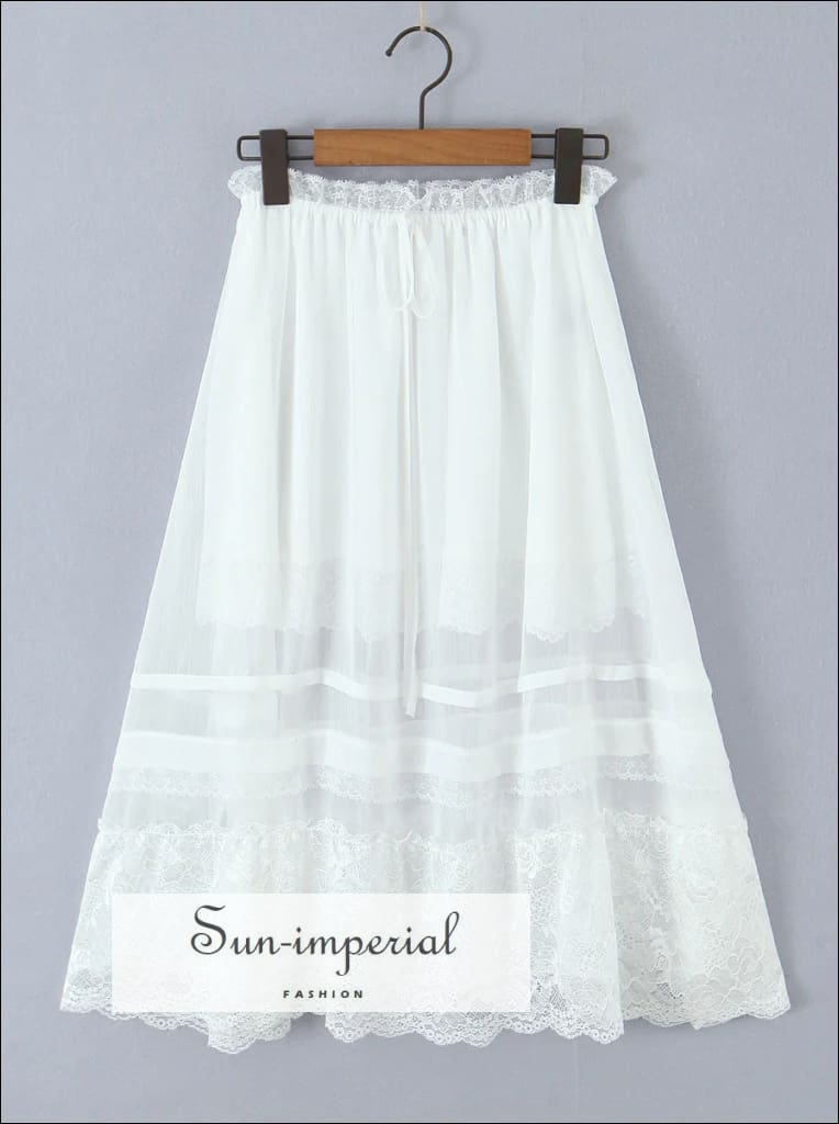 White Lace Semi-Sheer Bow Laced A-Line Midi Skirt – Holiday & Boho Style