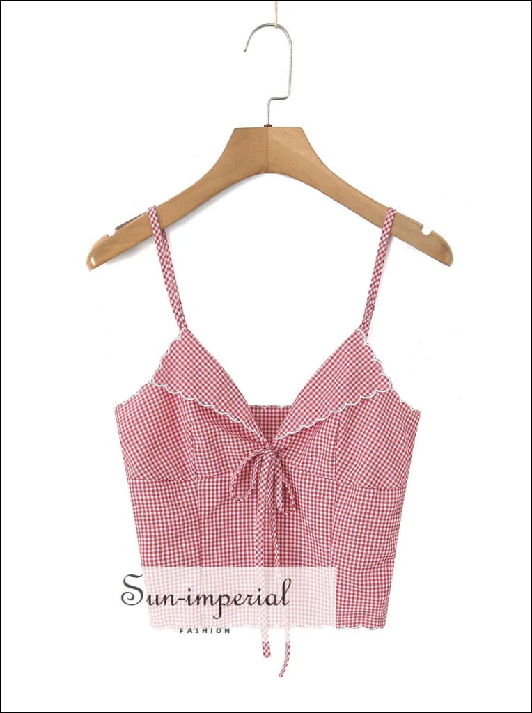 Tags: Red Gingham, Plaid Camisole, Summer Crop Top, V-Neck Top, Bow Detail, Slim Fit, Womens Tank, Casual Summer, Crop Blouse, Trendy Tops