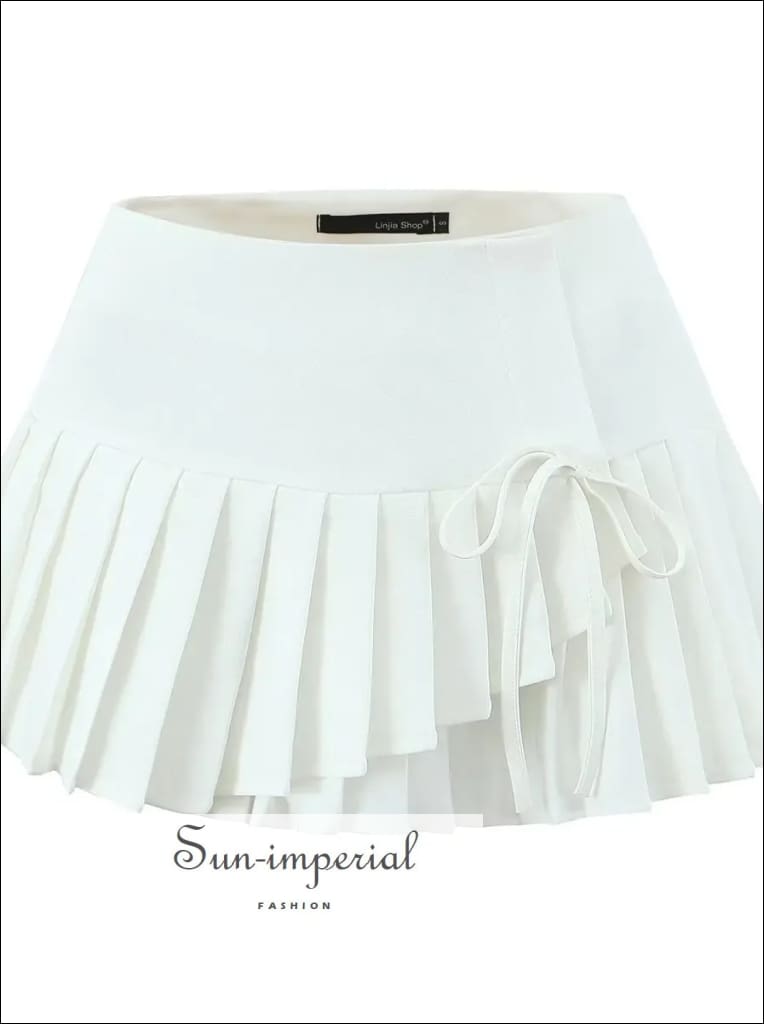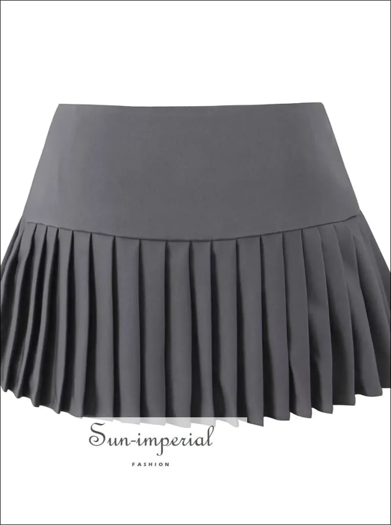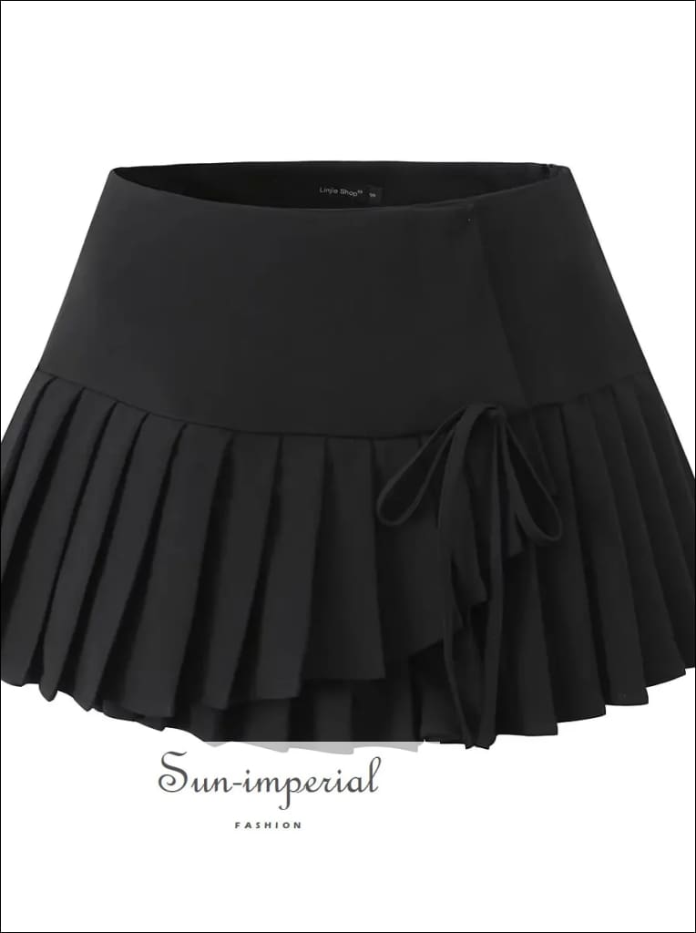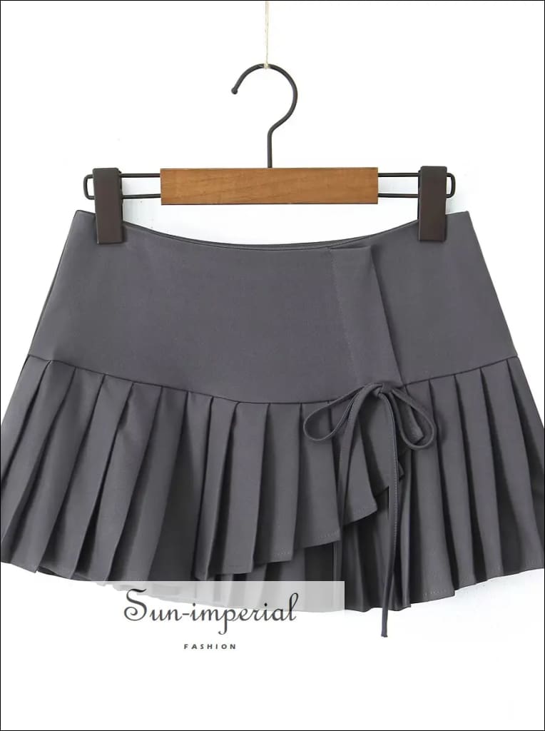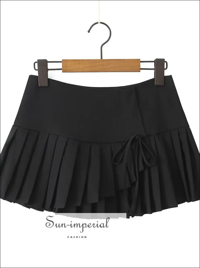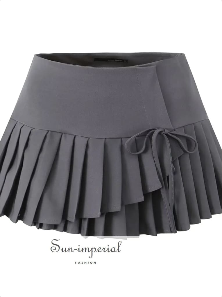 This asymmetrical pleated mini skirt features a modern cross-slit design with a low waist fit for a clean, structured look. Designed with a side zipper for easy wear, the skirt offers a sharp silhouette while the pleated construction adds movement and dimension.